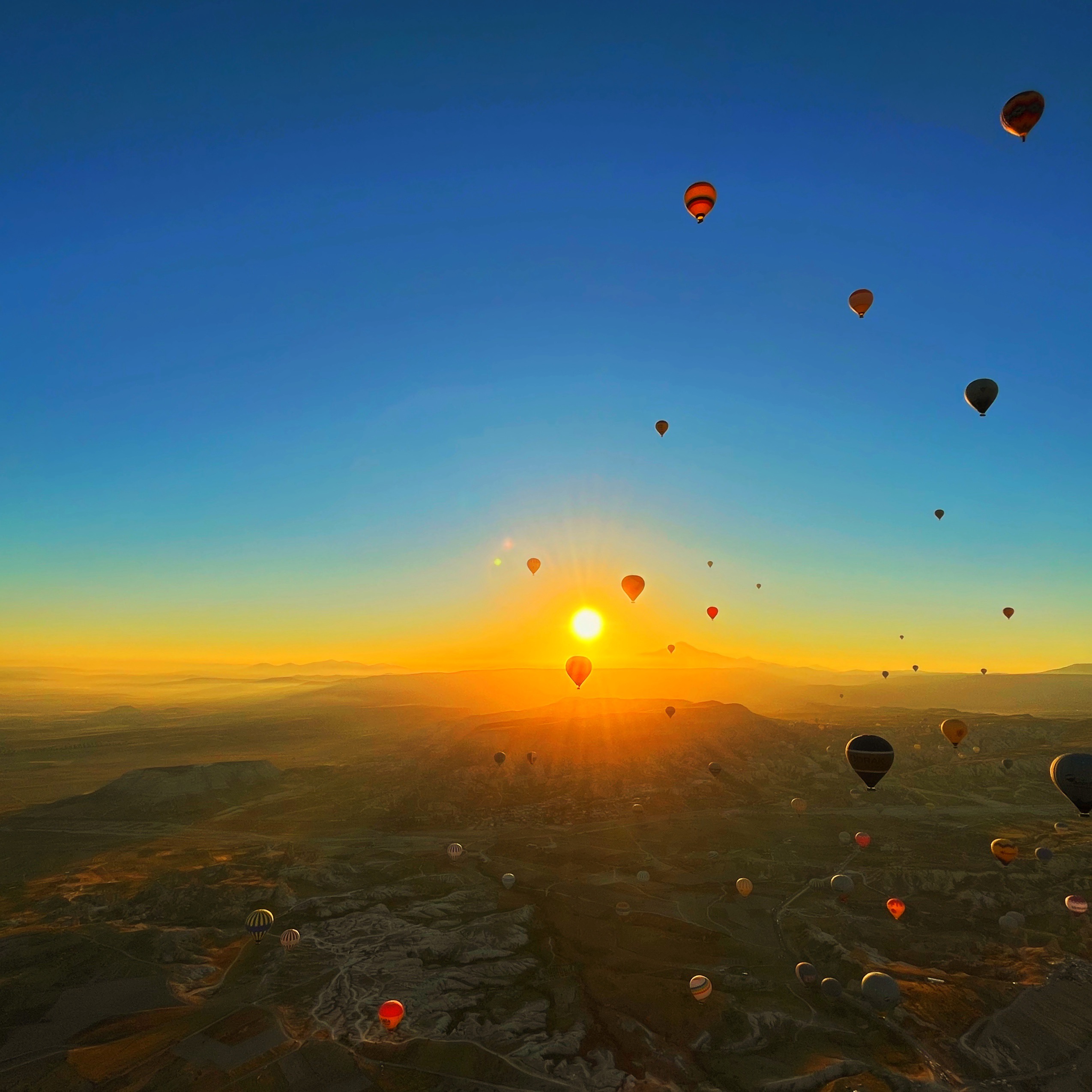 太陽を背景に、逆光で浮かび上がる気球のシルエットが印象的な一枚です。空と大地のグラデーションの中に大小さまざまな気球が配置され、壮大なスケール感と奥行きを見事に表現しています。